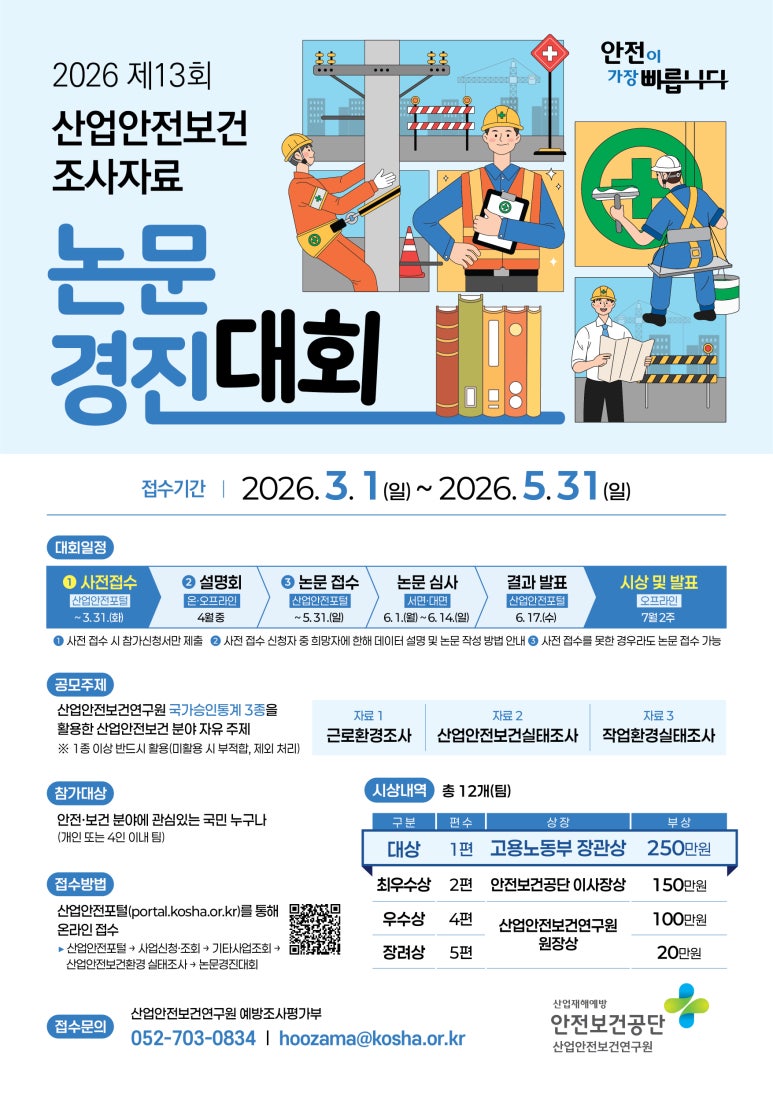 산업안전보건연구원에서 제13회 산업안전보건 조사자료 논문 경진대회를 개최하오니 관심있으신 회원님께서는