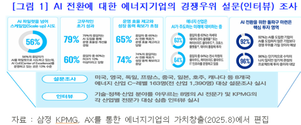 DX가 디지털 기술을 통한 산업의 변화를 의미했다면 AX는 디지털에서 더 나아가 인공지능을 통해 산업을 구상하고 변환한다. 인간의 지속적인 개입 없이도 주어진 환경을 인식하고 목표를 설정하며, 그 목표를 달성하기 위해 스스로 판단하고 행동하는 것이 자율 AI 시스템이다. 인공지능을 중심으로 운영체계와 전략을 재설계하는 점이 다르다. KPMG 보고서에 따르면 글로벌 에너지기업들은 AI가 경쟁 우위의 핵심임을 인식하고, 이미 파일럿(Pilot) 단계를 넘어 스케일업(Scale up) 단계로 진행하고 있다. [그림1 참조]